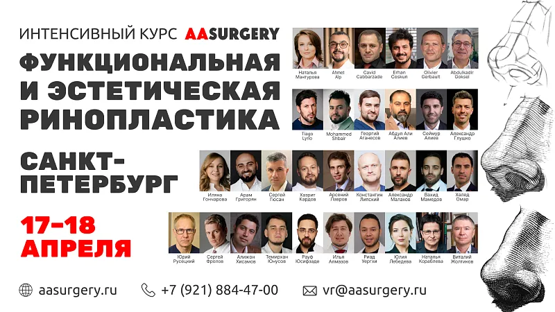 AASURGERY приглашает пластических хирургов и специалистов в области ринопластики принять участие в международном интенсивном курсе «Функциональная и эстетическая ринопластика», который пройдет 17–18 апреля в отеле «Введенский», г. Санкт-Петербург.
