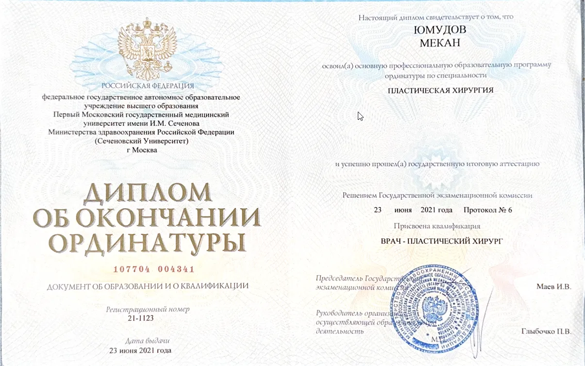 2021 - ФГАОУ ВО Первый МГМУ им. И.М. Сеченова Минздрава РФ , Пластическая хирургия