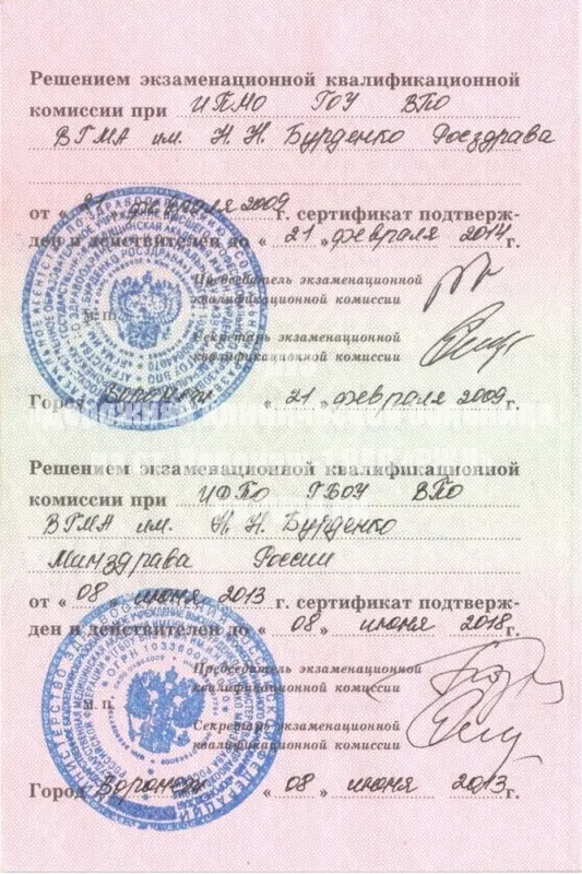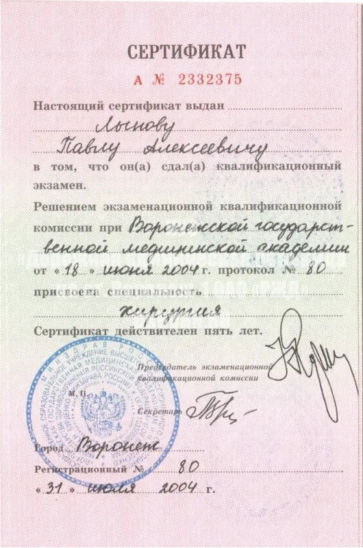 В 2002 году с отличием окончил лечебный факультет Воронежской Государственной медицинской академии им. Н.Н. Бурденко • С 2002 по 2004 год обучался в клинической ординатуре по специальности хирургия на кафедре госпитальной хирургии ВГМА им Н.Н. Бурденко. • В 2006 году первичная специализация по специальности эндоскопия на базе ГОУ ВПО ВГМА им. Н.Н. Бурденко Росздрава. • В 2010 году первичная переподготовка по специальности "Пластическая хирургия".