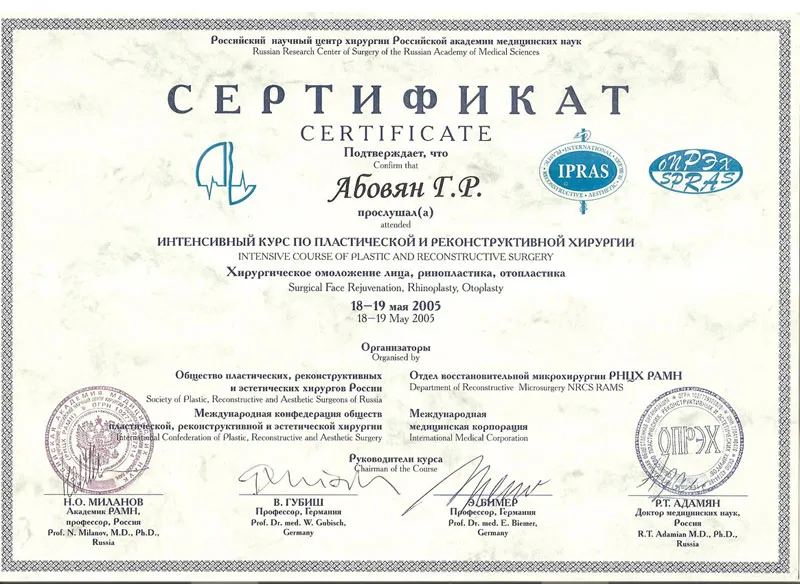 Абовян Георгий Робертович окончил Крымский Медицинский Институт, после чего переехал в Москву и продолжил обучение в интернатуре и ординатуре при ММА им. И.М. Сеченова. После 2002 г. в сферу профессиональных интересов Абовяна Г.Р. попадает пластическая хирургия, вследствие чего врач поступает в аспирантуру РНЦХ им. Вишневского и защищает диссертацию по восстановительной микрохирургии.