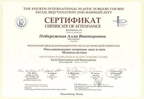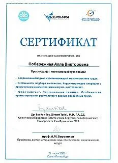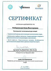 Алла Побережная — пластический хирург со стажем более 18 лет. Ассистент кафедры Педиатрического университета( Санкт-Петербург). Выполняет весь спектр эстетических операций на лице и теле. Не оперирует пациентов без показаний. В сферу особых интересов хирурга входит — омолаживающие операции на лице , в том числе эндоскопические, и коррекция послеродовых и после значительного снижения веса изменений молочных желез и контуров тела