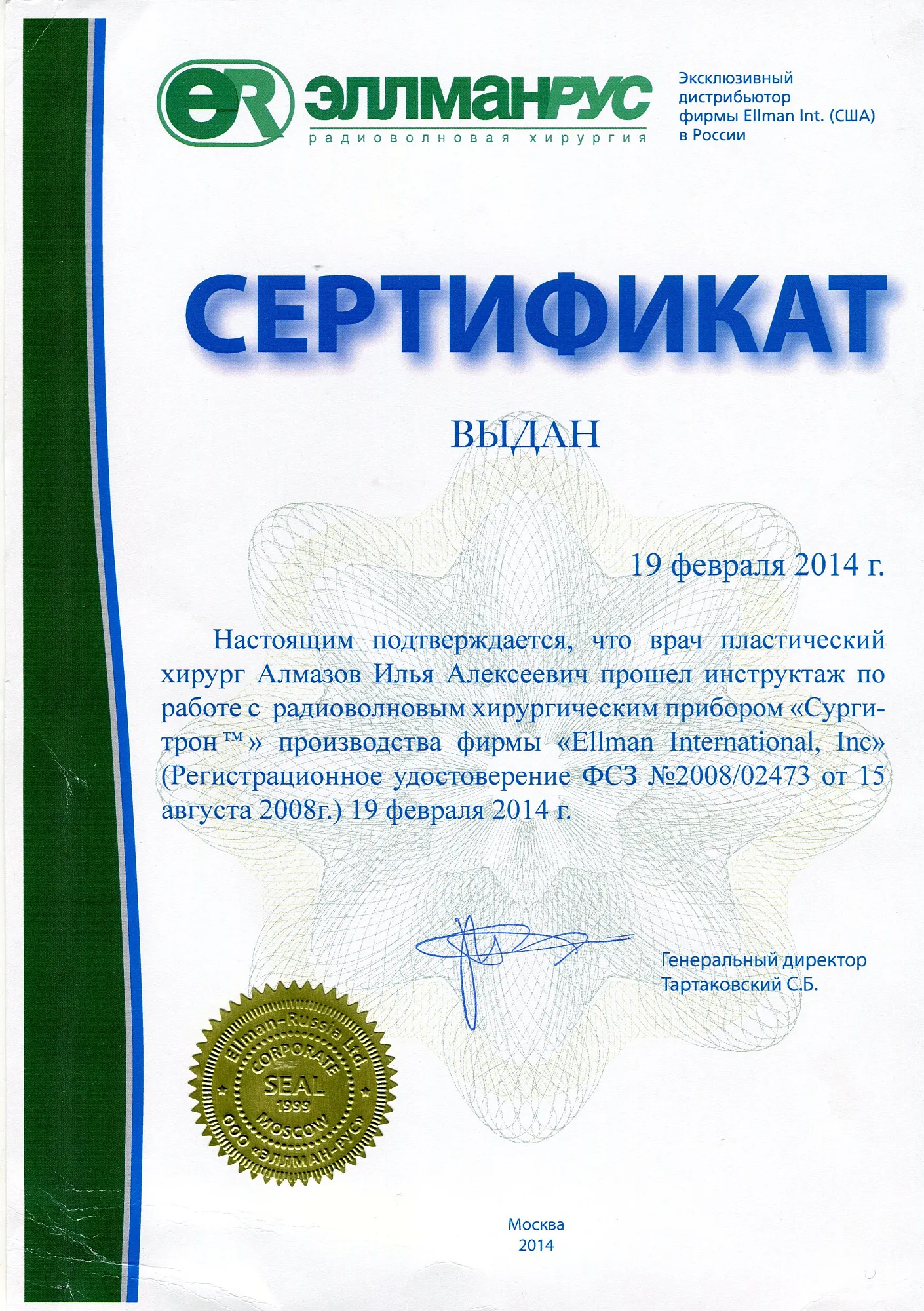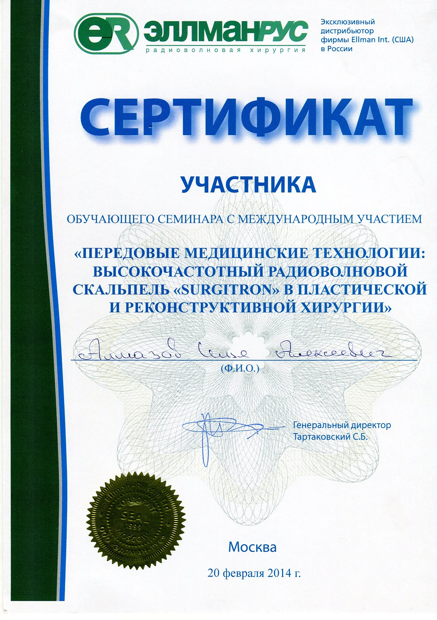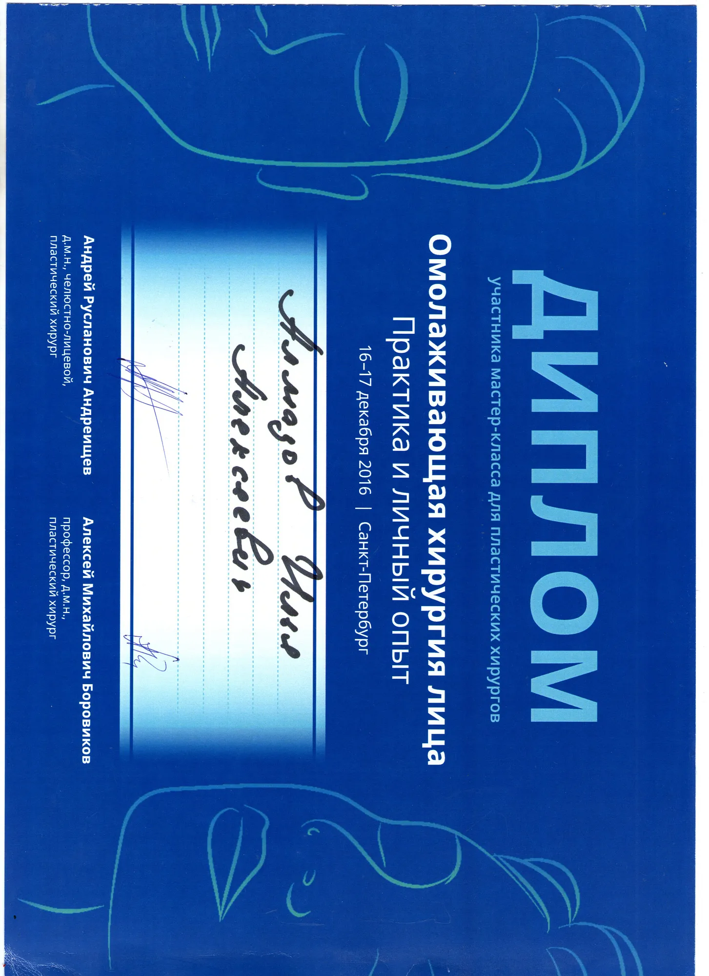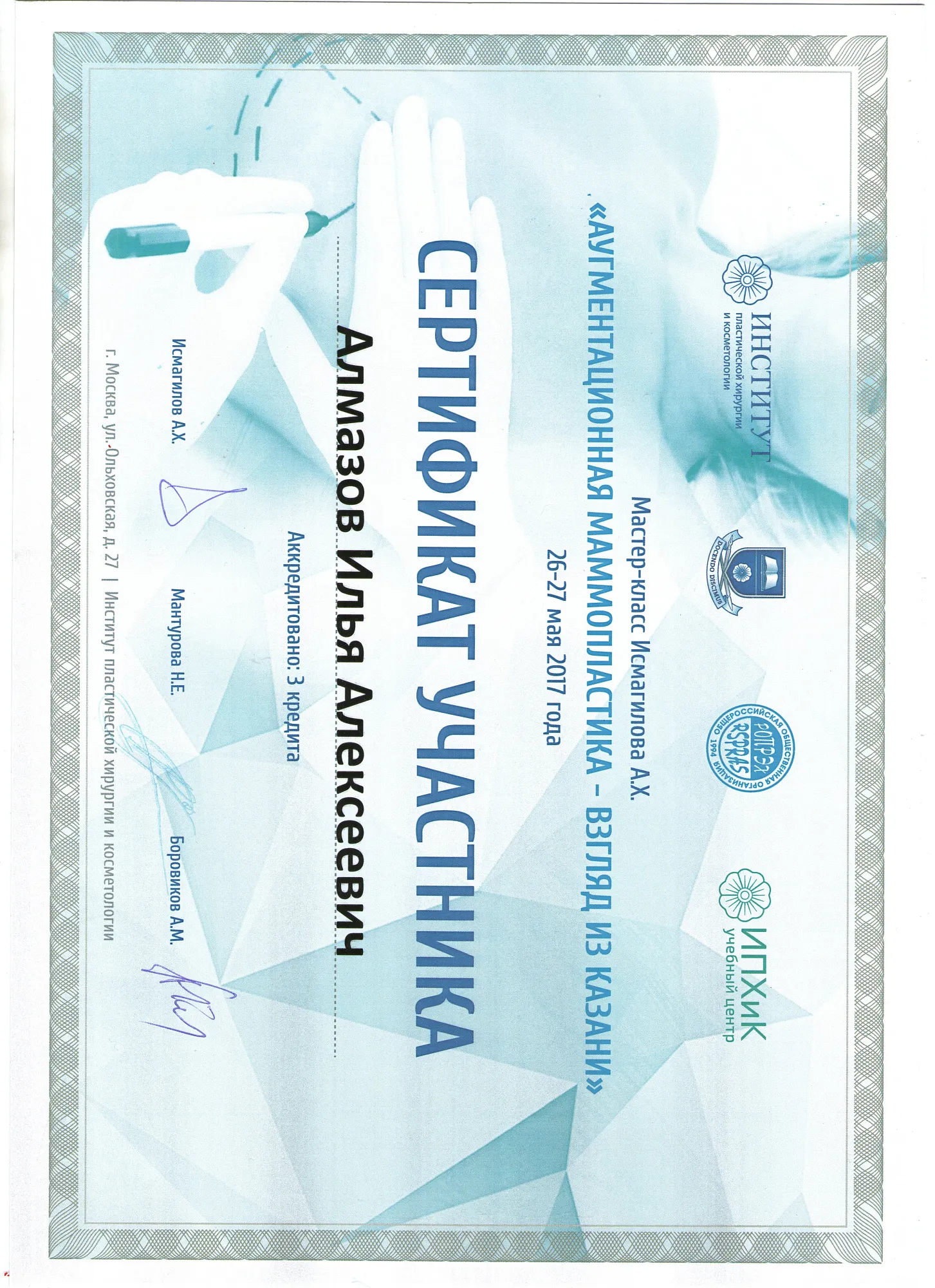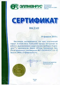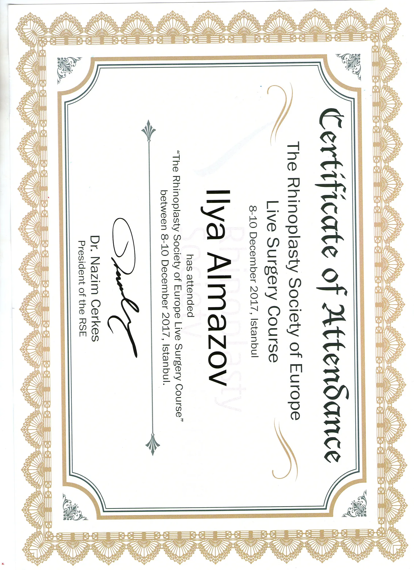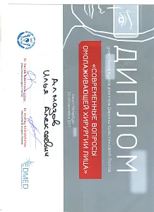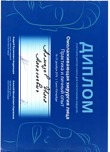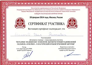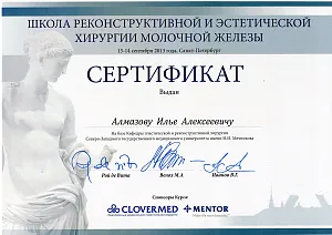 Пластический хирург. Special CME courses (Пройденные курсы и стажировки по пластической хирургии) с 2013 по 2017 год: Германия (Prof. Dr. med. Dr. h.c. Wolfgang Gubisch, Senior Director of the Clinic for Fascial Plastic Surgery, Marienhospital Stuttgart), Бельгия (Joan VANDEPUTTE dipl. EBPS, FCCP, MD), Турция (Prof. Dr. Nazim CERKES, President of Rhinoplasty Society of Europe, Vice President of International Society of Aesthetic Plastic Surgery).