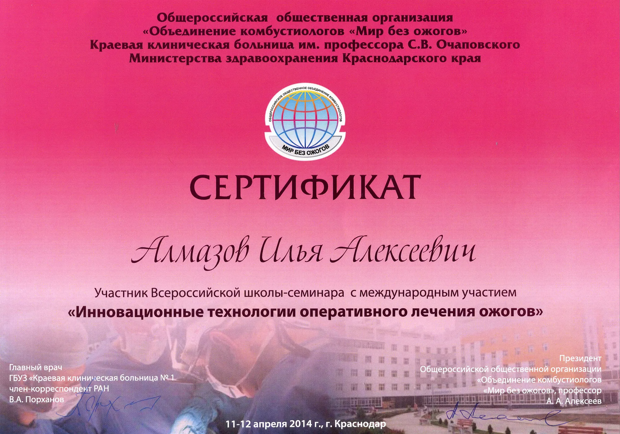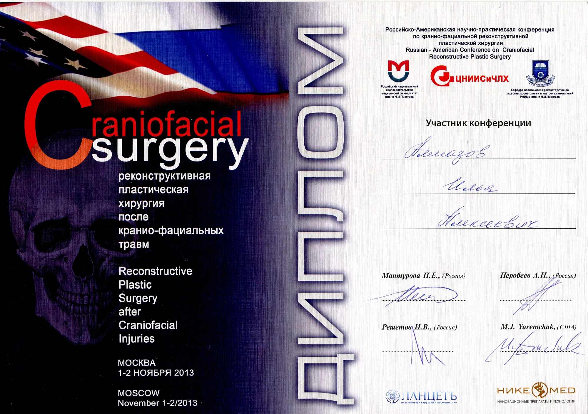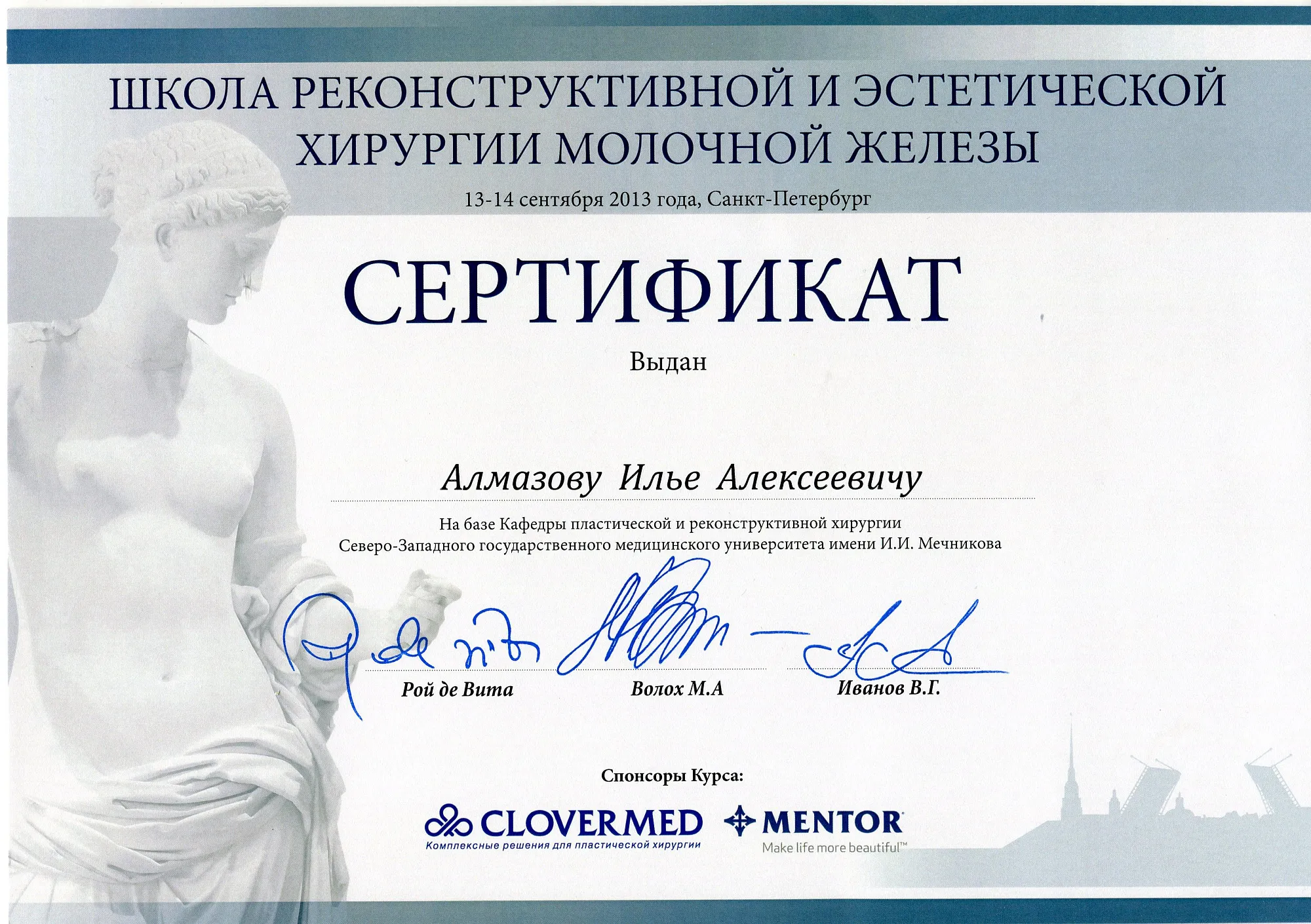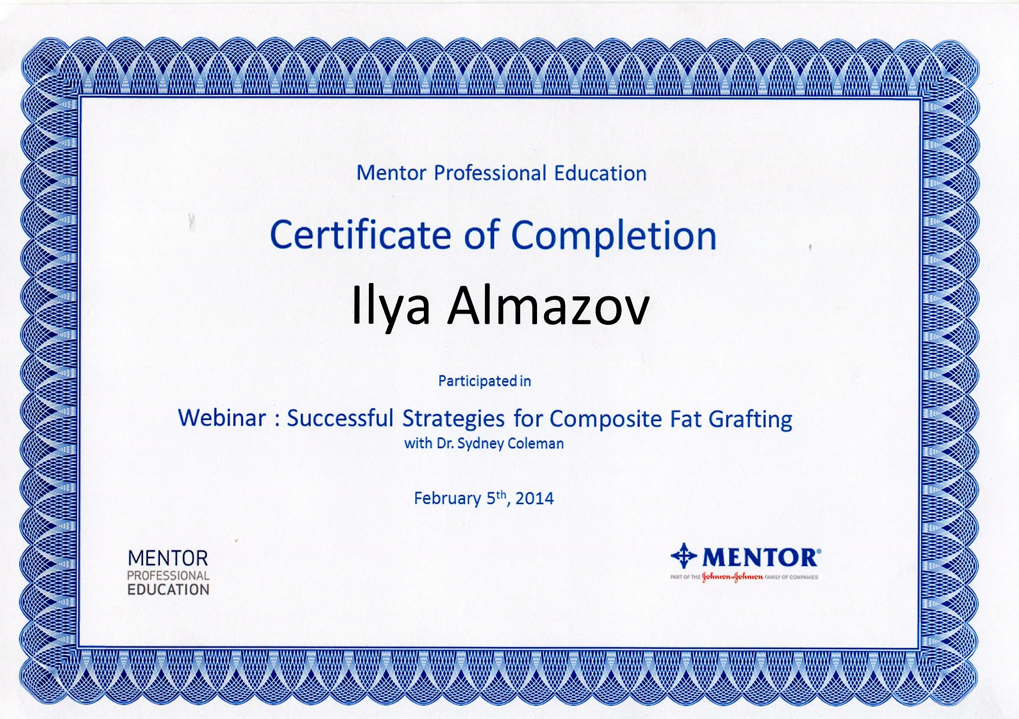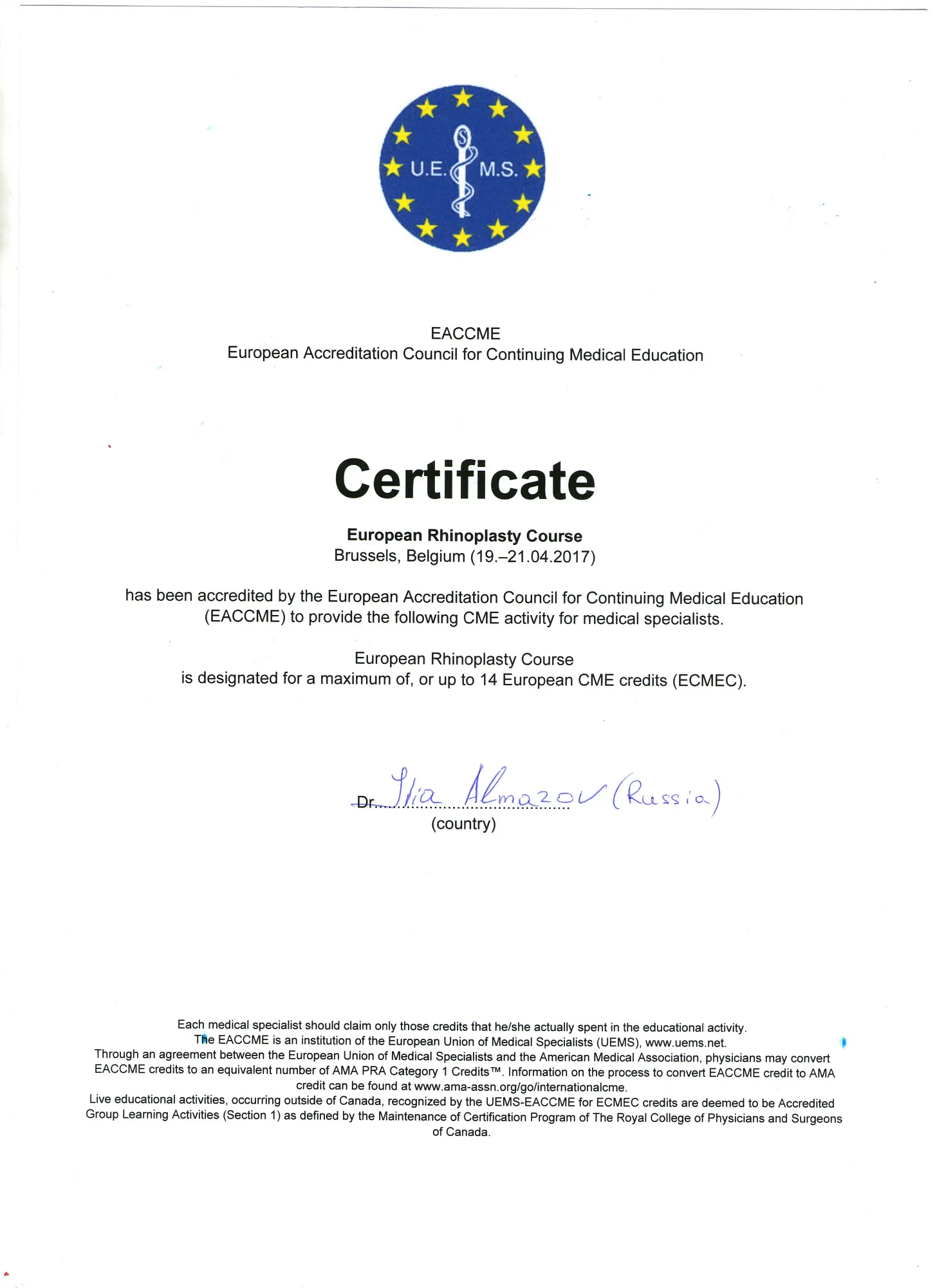Пластический хирург. Special CME courses (Пройденные курсы и стажировки по пластической хирургии) с 2013 по 2017 год: Германия (Prof. Dr. med. Dr. h.c. Wolfgang Gubisch, Senior Director of the Clinic for Fascial Plastic Surgery, Marienhospital Stuttgart), Бельгия (Joan VANDEPUTTE dipl. EBPS, FCCP, MD), Турция (Prof. Dr. Nazim CERKES, President of Rhinoplasty Society of Europe, Vice President of International Society of Aesthetic Plastic Surgery).