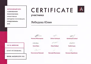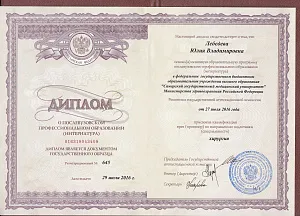 Окончила лечебный факультет Самарского государственного медицинского университета в 2015 году. 2015-2016 гг - клиническая интернатура по специальности "хирургия" 2016-2018 гг - клиническая ординатура по специальности "пластическая хирургия" на кафедре пластической и реконструктивной хирургии ФП и ДПО СПбГПМУ. С 2018 года обучается в очной клинической аспирантуре на кафедре пластической и реконструктивной хирургии ФП и ДПО СПбГПМУ.