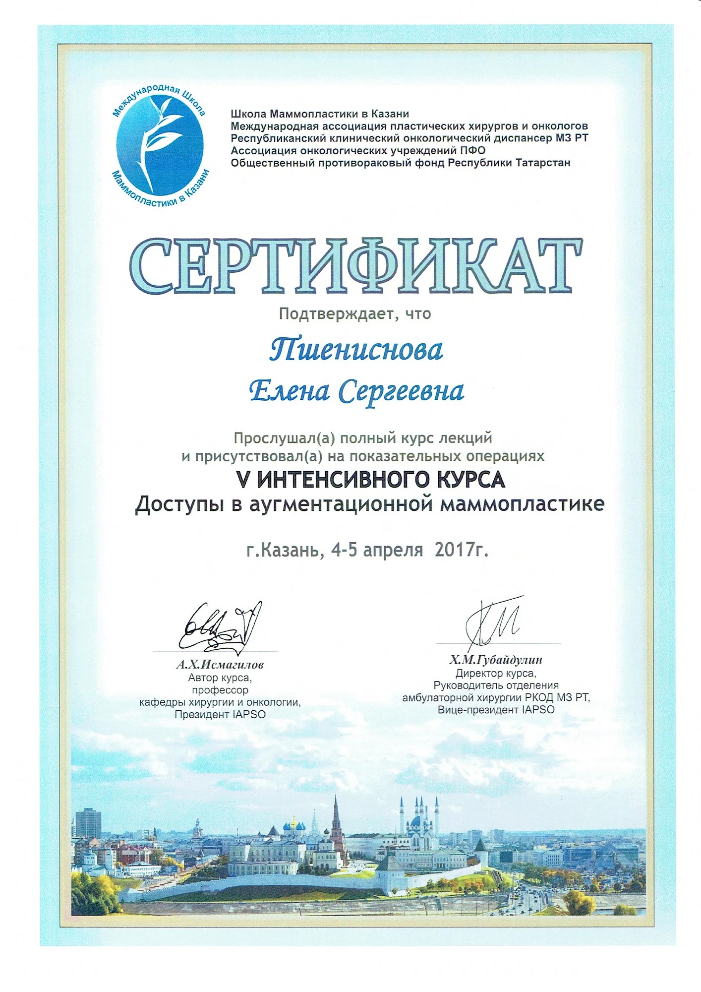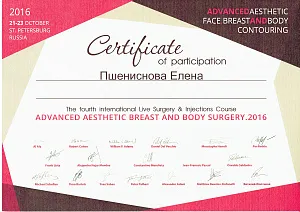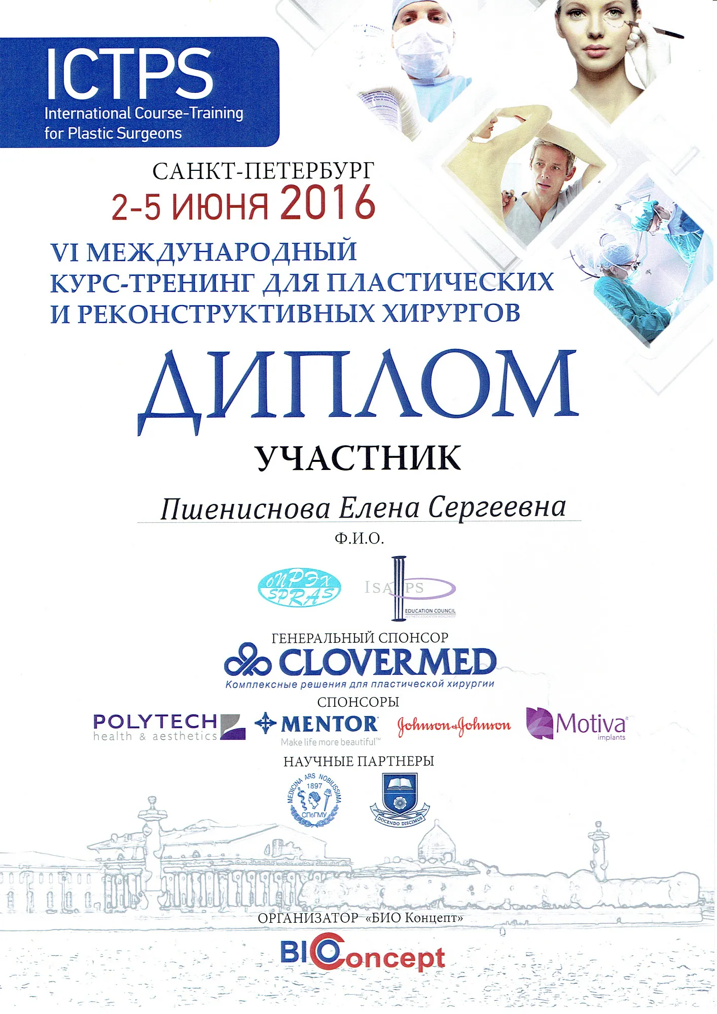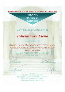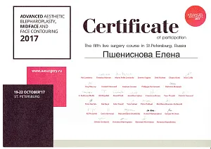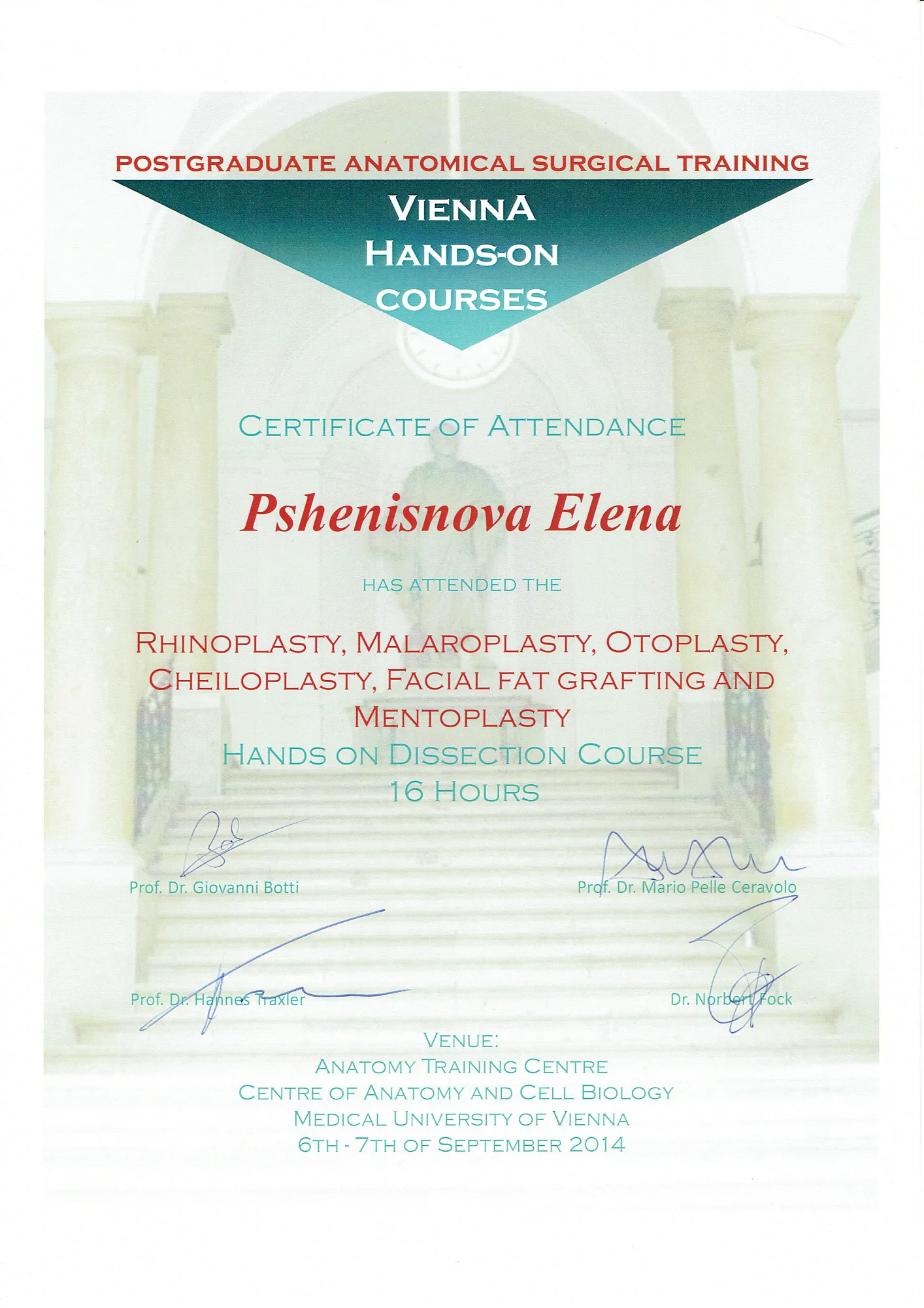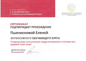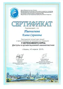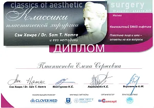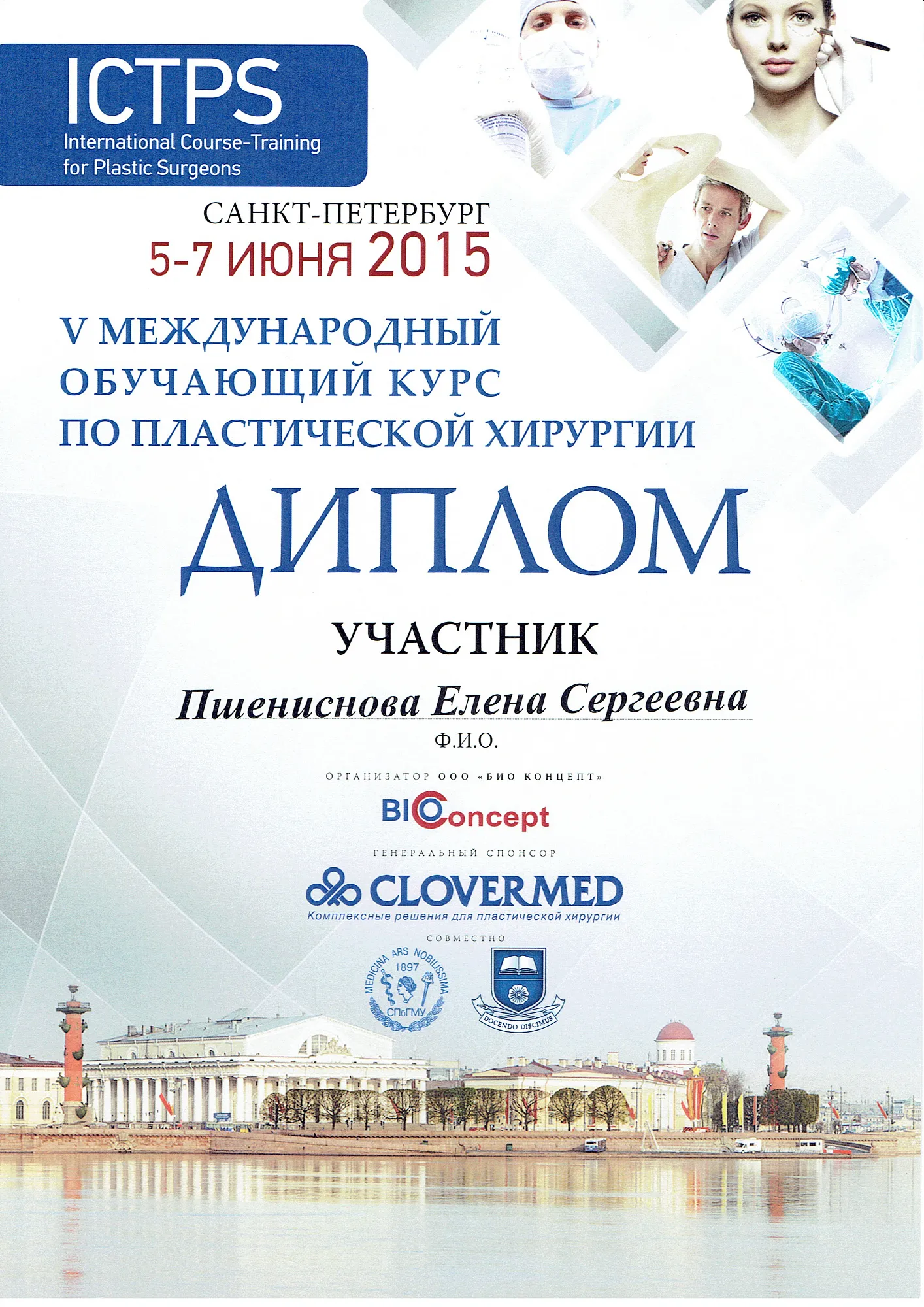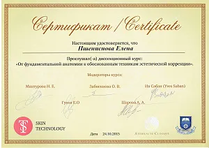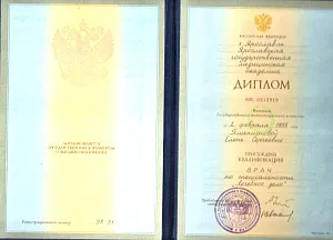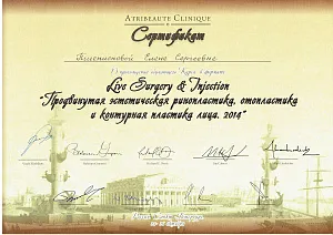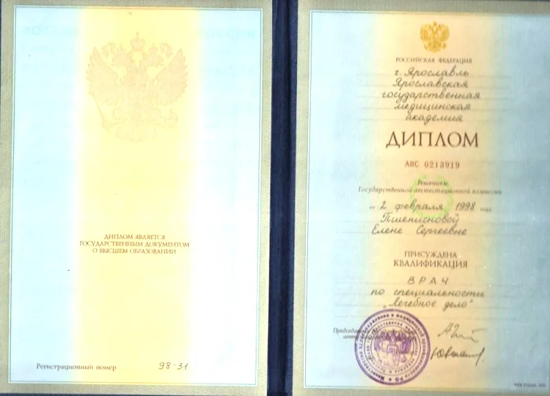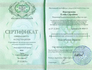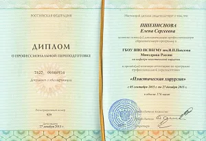 1998г.- окончила Ярославскую государственную медицинскую академию по специальности врач «лечебное дело». Прошла курс последипломного образования (интернатуру, ординатуру) по оториноларингологии, интернатуру по общей хирургии. Получила специализацию "Пластическая хирургия" в ГБОУ ВПО ПСПбГМУ им. И.П. Павлова Минздрава России на кафедре пластической хирургии (г. Санкт-Петербург). 20 лет стажа в хирургии.