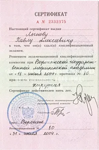 В 2002 году с отличием окончил лечебный факультет Воронежской Государственной медицинской академии им. Н.Н. Бурденко • С 2002 по 2004 год обучался в клинической ординатуре по специальности хирургия на кафедре госпитальной хирургии ВГМА им Н.Н. Бурденко. • В 2006 году первичная специализация по специальности эндоскопия на базе ГОУ ВПО ВГМА им. Н.Н. Бурденко Росздрава. • В 2010 году первичная переподготовка по специальности "Пластическая хирургия".