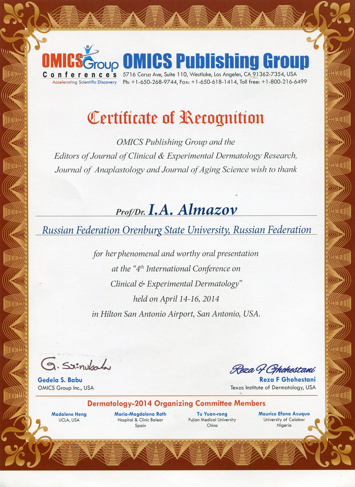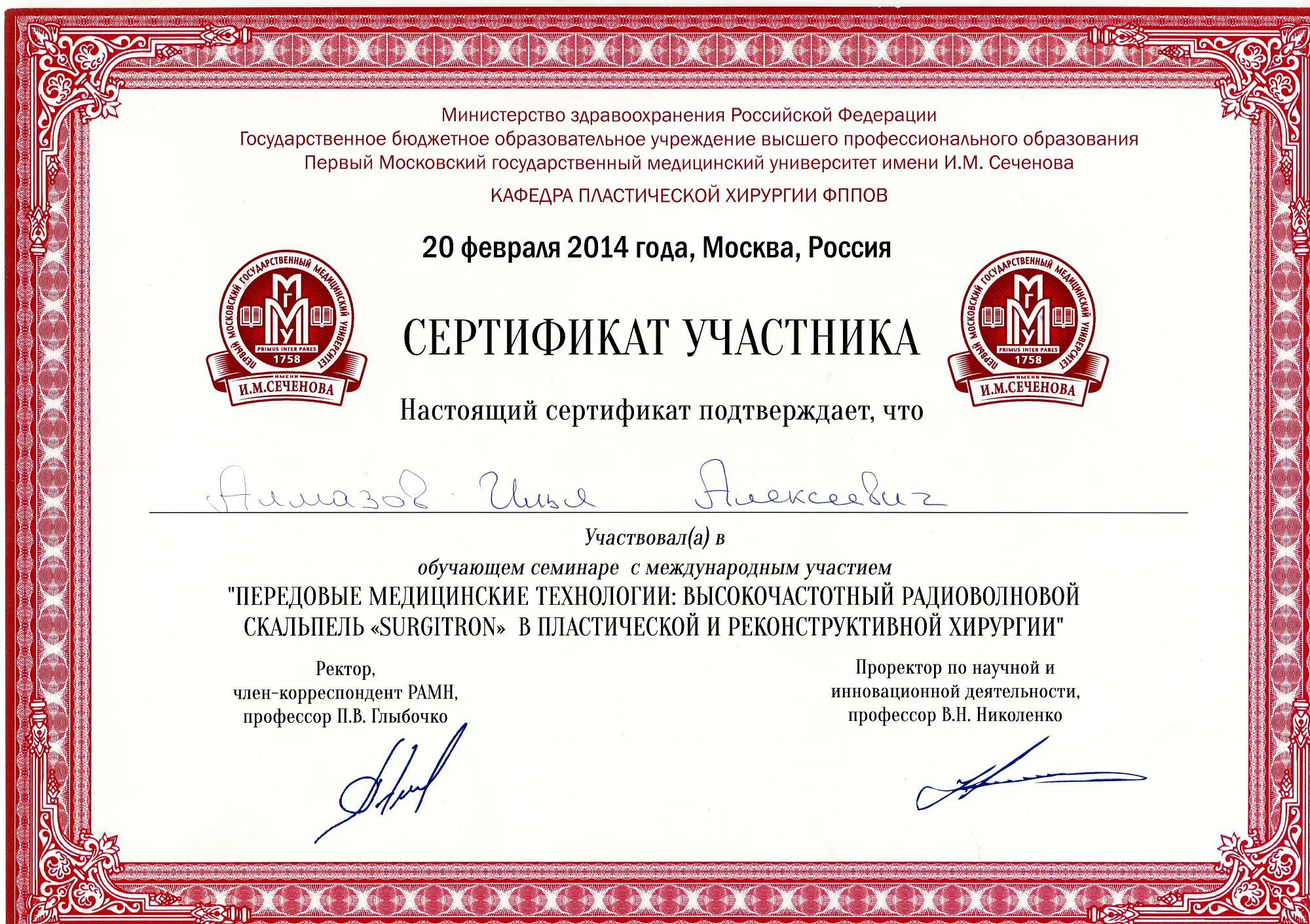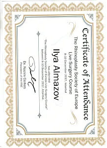 Пластический хирург. Special CME courses (Пройденные курсы и стажировки по пластической хирургии) с 2013 по 2017 год: Германия (Prof. Dr. med. Dr. h.c. Wolfgang Gubisch, Senior Director of the Clinic for Fascial Plastic Surgery, Marienhospital Stuttgart), Бельгия (Joan VANDEPUTTE dipl. EBPS, FCCP, MD), Турция (Prof. Dr. Nazim CERKES, President of Rhinoplasty Society of Europe, Vice President of International Society of Aesthetic Plastic Surgery).